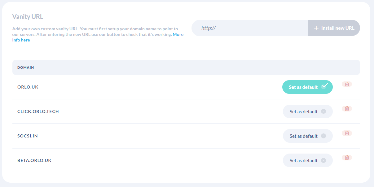 Enter Your URL: Scroll to the bottom of the page to find the Vanity URL section. You will see your current active URL (defaulted to "orlo.uk"). Enter your new custom domain in the provided text box.