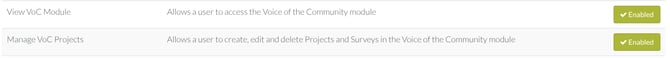 - To access the Voice of the Community area, users will need the 'View VOC Module' and 'Manage VOC Projects' permissions enabled in the 'User Settings' area.